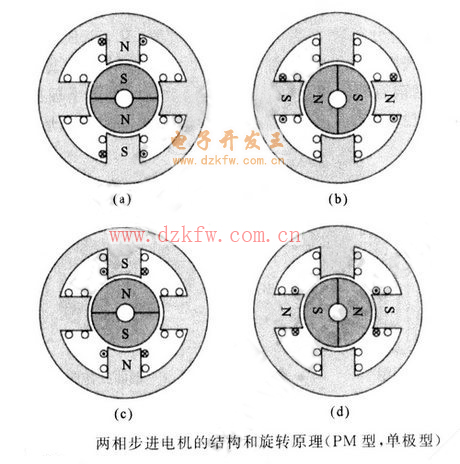 两相PM型电机定子内圆有四个磁极,每个磁极上绕了一个线圈,每两个相差180°的磁极线圈组成一相绕组,PM型步进电机的单极和双极工作方式在上文“两相步进电机”中均已说明。