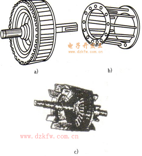a)笼型绕组 b) 转子外形 c) 铸铝笼型转子