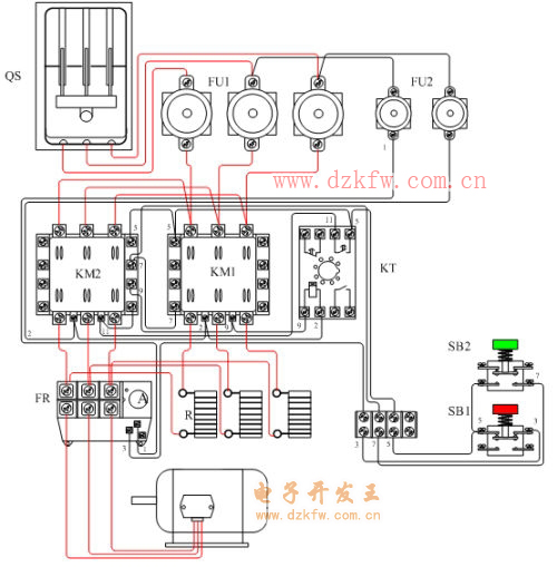 由于在电阻上有热能的损耗,如果用电抗器则体积、成本又较大,因此这种串电阻降压启动电动机的方法目前很少被采用。下图所示的为串电阻降压启动原理线路图: