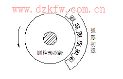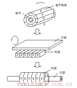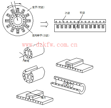 直线电机可以认为是旋转电机在结构上的一种演变,它可以看作将旋转电机在径向剖开,然后将电机沿着圆周展开成直线,形成了扁平型直线电机,见图除了扁平型直线电机的结构形式外,将扁平型直线电机沿着和直线运动相垂直的方向卷成圆柱状(或管状),就形成了管型直线电机,见图2。由定子演变而来的一侧称为初级,由转子演变而来的一侧称为次级。此外,直线电机还有弧型和盘型结构,分别见图3。所谓弧型结构,就是将扁平型直线电机的初级沿运动方向改成弧型,并安放于圆柱形次级的柱面外侧;盘型直线电机是将初级放在次级圆盘靠近外缘的平面上。