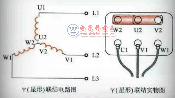 ■这种结构的三相电动机U1~U2为一个线圈绕组;V1~V2为第二个线圈绕组;W1~W2为第三个线圈绕组。它们三个线圈绕组的U1、V1、W1正常情况下都是作为电动机的引入接线端子;而U2、V2、W2一般都是将其用短接片连接在一起。这样三个线圈绕组每组承受的电压为相电压220V;而U1、V1、W1它们之间每两个线圈绕组所承受的电压为线电压380V。