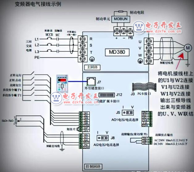 ■此时,需要将电动机的内部的接线柱按照U1与W2连接;V1与U2连接;W1与V2 连接在一起。这样输出三根引线接在变频器的输出端子的U、V、W连接起来即可运转起来。
