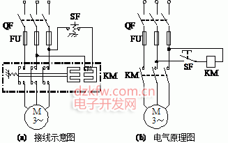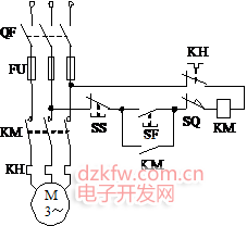 (2)停止过程。按下停止按钮SS,接触器KM线圈断电,与SF并联的KM的辅助常开触点断开,以保证松开按钮SS后KM线圈持续失电,串联在电动机回路中的KM的主触点持续断开,电动机停转。