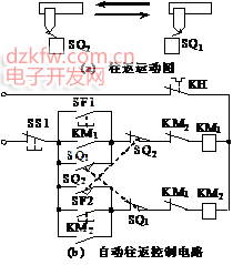 按下正向起动按钮SB1,电动机正向起动运行,带动工作台向前运动。当运行到SQ2位置时,挡块压下SQ2,接触器KM1断电释放,KM2通电吸合,电动机反向起动运行,使工作台后退。工作台退到SQ1位置时,挡块压下SQ1,KM2断电释放,KM1通电吸合,电动机又正向起动运行,工作台又向前进,如此一直循环下去,直到需要停止时按下SS1,KM1和KM2线圈同时断电释放,电动机脱离电源停止转动。