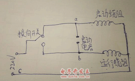 假如三个接线头分别是a b c,那么就分别测ab的阻值,ac的阻值,bc的阻值。测的阻值最大的一组就是启动绕组和运行绕组串联的阻值(我图上就是ab两段的阻值)。那么剩下的一个接线头就是公共点接电源线(我图上就是c点)。然后把电容的两根线接到a b点上。再把换向开关接到a b点和电源另一个点上(如图)。这样单相电机电容正反转启动图就完成了!