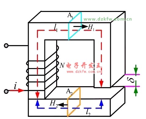 所示磁路由铁磁材料及空气隙两部分组成,而铁磁材料这部分的截面积又分为A1, A2,故整个磁路应分为三段。