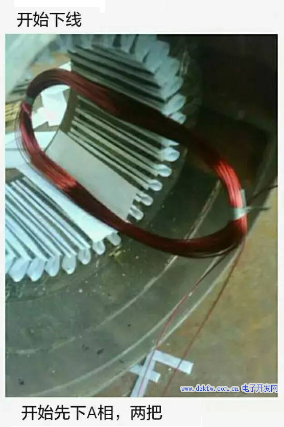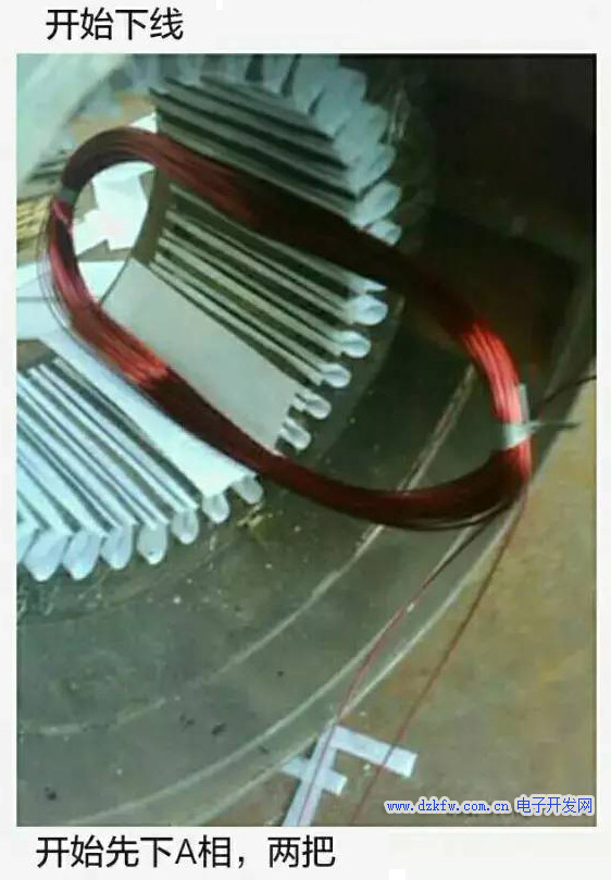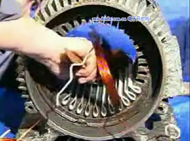 效边全部嵌入槽内。如果尚有未嵌入的导线有效边部分,可用划线片将该部分逐根划入槽内。导线嵌入后,用划线片将槽内导线从槽的一端连续划到另一端,一定要划出头。这种梳理方式的目的,是为了槽内导线整齐平行,不交叉。然后再把层间绝缘(对双层绕组)摺成"∩"形,插入槽口包住槽内导线。对线圈未嵌入的另一有效边则采取吊边。
