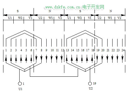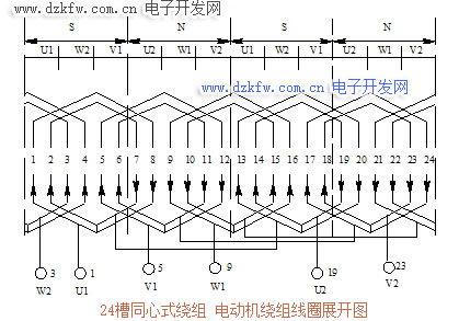 V相: 5-12组成一个节距等于7的大线圈,6-11组成一个节距等于5的小线圈,同样, 17-24组成大线圈,18-23组成小线圈。