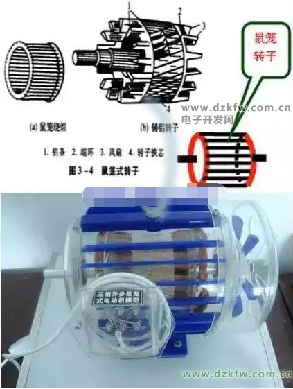 鼠笼式转子,如图3-4这种转子用铜条安装在转子铁芯槽内,两端用端环焊接,形状像鼠笼。