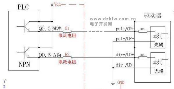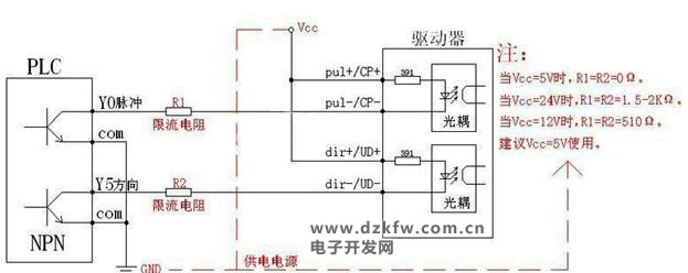 接线一定要以构成回路为准则,如果是共阴极接法,那就反过来把PUL+和DIR+分别接到Y0和Y1了,COM0和VCC并一起接+24V,PUL-,DIR-和GND并一起接0V。接不接电阻同样要根据上面的原则。