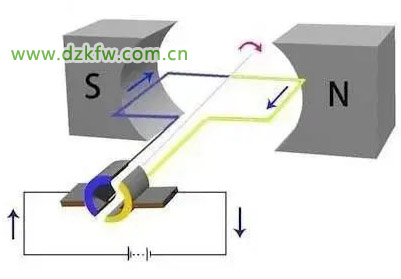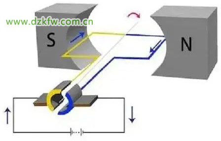接上电源以后,电流如图1中箭头所示。根据左手定则,黄色线圈受到垂直向上的电磁力;蓝色线圈受到垂直向下的电磁力。电机转子开始作顺时针旋转,旋转90度以后,如图2所示: