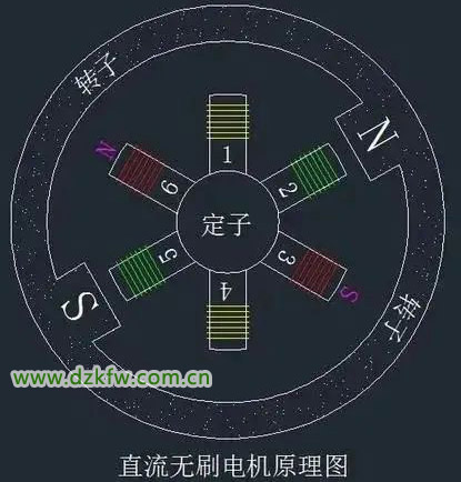 直流无刷电机如图5所示,这是一个直流无刷电机结构模型图。它是由定子和转子两部分组成,其中转子上有一对磁极;定子上面绕了有很多组线圈,图中画了有6组线圈。