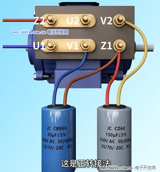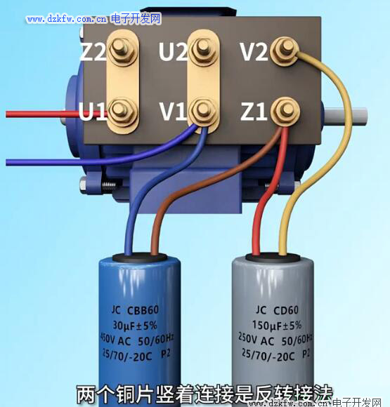 看接线柱的字母U1、U2 分别接运行绕组的两个出线 V1、V2接离心开关的两个出线。V1接启动绕组的两个出线启动电容接Z1、V2 运行电容接V1、Z1。至于反正转也很简单!把两个连接片横着连或者竖着连。