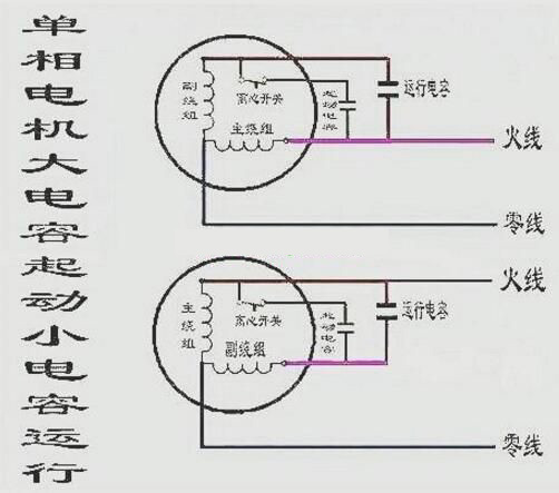 1、一般三相电机使用均为380V/丫型接法,改时要从丫点中引一根线,为了配合下面电路图说明,暂时称它为220Ⅴ电机的零线,取三相中的任意一相,我们暂时称它为主绕组线圈,再取任意一相为副绕组,还有另外一相不用,不管它。副绕组与主绕组有一头都是电机丫型接法的中性点,也就是上面我们假设的(零线),主绕组另一端引出来一根线,暂时称它为火线。在副绕组的另一端出来需要并联两只耐压≥450V的电容,一只为运行电容,电容另一端与暂时定的火线相联接。另一只为启动电容,它是一个由需要另外购买的(电机专用离心开关)此离心开关需要固定在电机尾部风扇轴上,随电机转动,另一端固定在静止的壳体上,有二根导线与起动电容器一头串联,另一头接到火线上。离心开关工作原理是它有二个离心球,当电机处于0速和刚起动时低速时,它的触点是闭合导通的,也就是离心球没有离心抛物形成作用力,当电机通电由静止速度逐渐圆周加速到一定转速时离心抛物作用力大于二个离心球的反作用力后,这时离心开关会翻转工作状态,由原来的常闭马上变成常开,切断起动电容器,留下一只运转必须要有的,产生旋转磁场的运转电容,这也是为什么单相电机必须要有起动运转电容,电机才会转起来的主要原因。