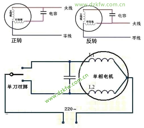 4、上图为改220单相电机的正反转控制图,由于主绕组与副绕组的匝数、漆包线的截面都一样,正反转时只是将它们之间灵活切换,故非常方便。