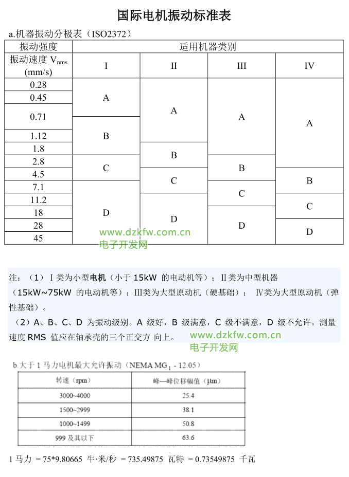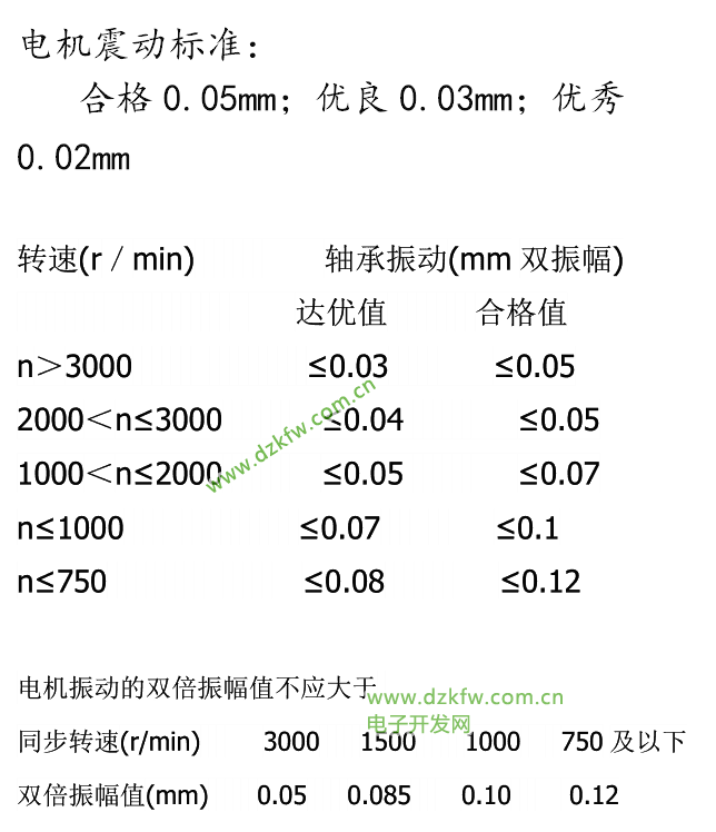 电机振动的原因很多,也很复杂。8极以上大极数电机不会因为电机制造质量问题引起振动。振动常见于2--6极电机,GB10068-2000,《旋转电机振动限值及测试方法》规定了在刚性基础上不同中心高电机的振动限值、测量方法及刚性基础的判定标准,依据此标准可以判断电机是否符合标准。国际电机振动标准表如下: