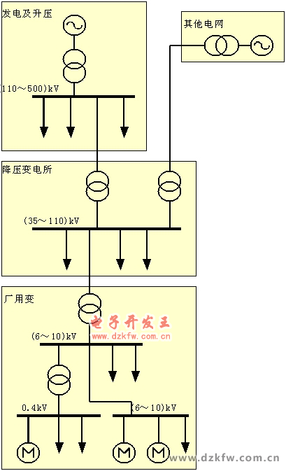 一个完整的电力系统由分布各地的各种类型的发电厂、升压和降压变电所、输电线路及电力用户组成,它们分别完成电能的生产、电压变换、电能的输配及使用。图1 电力系统的组成示意图