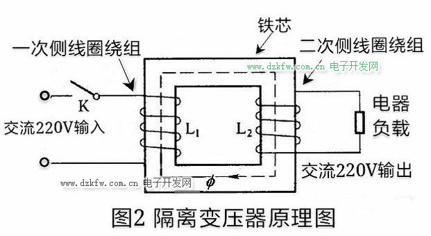 一般的隔离变压器是指一次侧绕组与二次侧绕组在电气上彼此可靠隔离的变压器,用于避免偶然同时接触带电体(其中包括因绝缘损坏而可能带电的金属结构部件)和地带来的危险,保护人生安全。下图为隔离变压器的原理图。
