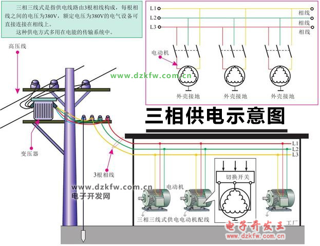 大部分工业和重大的电力设备都需要三相电压。三相电压系统是三个单相电压系统的组合。实际上,住宅用电的供给是从三相配电系统中抽取其中的某一项相电压。