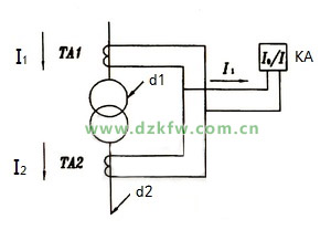 电流互感器TA1和TA2之间的区域就是差动保护区,当保护区内发生短路故障时,即变压器内部(如dl点),电流继电器KA中将产生较大的启动电流使保护装置动作,而当保护区外短路时,即变压器外部如(d2点),电流继电器中只流过一较小的不平稳电流,保护装置不会动作。