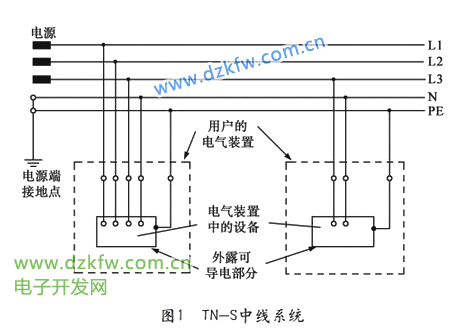 TN-S供电系统是把工作零线N和专用保护线PE严格分开的供电系统,TN-S 供电系统的特点如图
