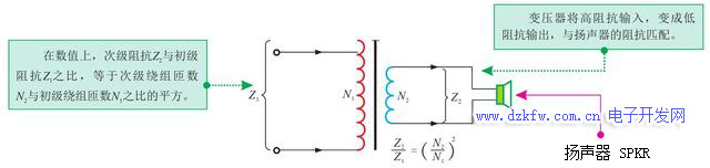 变压器通过初级线圈、次级线圈可实现阻抗变换,即初级与次级线圈的匝数比不同,输入与输出的阻抗也不同。图4-8为变压器的阻抗变换功能示意图。图4-8 变压器的阻抗变换功能示意图