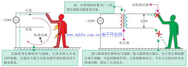 根据变压器的变压原理,初级部分的交流电压是通过电磁感应原理“感应”到次级绕组上的,而没有进行实际的电气连接,因而变压器具有电气隔离功能。图4-9为变压器电气隔离功能示意图。图4-9 变压器电气隔离功能示意图