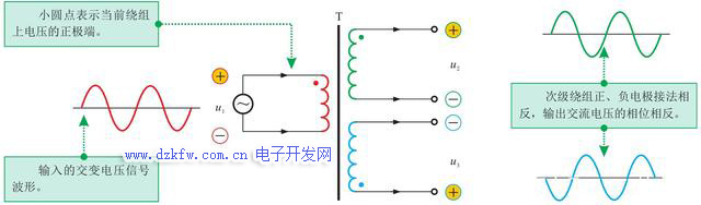 通过改变变压器初级和次级绕组的接法,可以很方便地将变压器输入信号的相位倒相。图4-10为变压器的相位变换功能示意图。图4-10 变压器的相位变换功能示意图