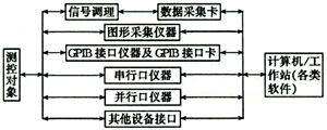 虚拟仪器是利用高性能的模块化硬件,结合高效灵活的软件来完成各种测试、测量和自动化的应用。灵活高效的软件能创建完全自定义的用户界面,模块化的硬件能方便地提供全方位的系统集成,标准的软硬件平台能满足对同步和定时应用的需求。虚拟仪器的本质是利用现有的计算机,加上特殊设计的仪器硬件和专用软件形成既有普通仪器的基本功能又有一般仪器所没有的特殊功能的高档低价的新型仪器。它是利用计算机强大的图形环境和在线帮助功能,建立虚拟仪器面板,以代替传统仪器完成对仪器的控制、数据分析和显示功能。虚拟仪器的输入输出由数据采集卡、GPIB卡等硬件模块完成,仪器的功能主要由软件构成。虚拟仪器系统框图如图1所示。
