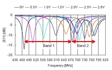 电调谐天线基本原理与前者相同,不同的是电调谐天线可以实现让天线谐振点微调到所设计的频带内每个点,且达到最好的阻抗匹配、最佳的辐射的性能,如下图,通过电压调整变容二极管改变切换点的接入阻抗,以改变天线的等效阻抗,从而达到实现从470Mhz到800Mhz的CMMB频段的最佳内置天线方案。