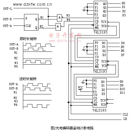 当光电编码器顺时针旋转时,通道A输出波形超前通道B输出波形90°,D触发器输出Q(波形W1)为高电平,Q(波形W2)为低电平,上面与非门打开,计数脉冲通过(波形W3),送至双向计数器74LS193的加脉冲输入端CU,进行加法计数;此时,下面与非门关闭,其输出为高电平(波形W4)。当光电编码器逆时针旋转时,通道A输出波形比通道B输出波形延迟90°,D触发器输出Q(波形W1)为低电平,Q(波形W2)为高电平,上面与非门关闭,其输出为高电平(波形W3);此时,下面与非门打开,计数脉冲通过(波形W4),送至双向计数器74LS193的减脉冲输入端CD,进行减法计数。