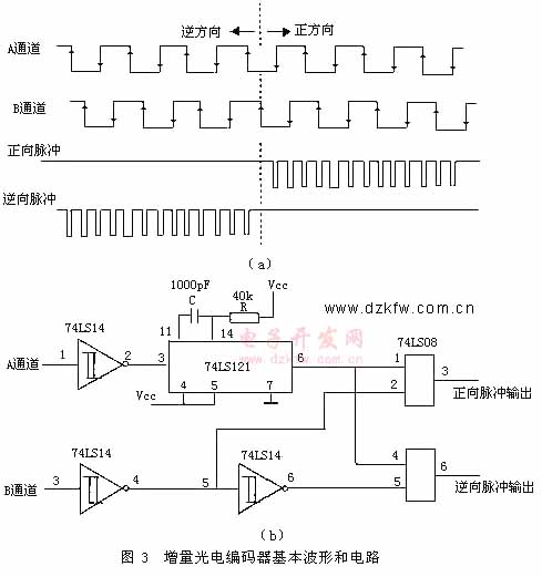 增量编码器是以脉冲形式输出的传感器,其码盘比绝对编码器码盘要简单得多且分辨率更高。一般只需要三条码道,这里的码道实际上已不具有绝对编码器码道的意义,而是产生计数脉冲。它的码盘的外道和中间道有数目相同均匀分布的透光和不透光的扇形区(光栅),但是两道扇区相互错开半个区。当码盘转动时,它的输出信号是相位差为90°的A相和B相脉冲信号以及只有一条透光狭缝的第三码道所产生的脉冲信号(它作为码盘的基准位置,给计数系统提供一个初始的零位信号)。从A,B两个输出信号的相位关系(超前或滞后)可判断旋转的方向。由图3(a)可见,当码盘正转时,A道脉冲波形比B道超前π/2,而反转时,A道脉冲比B道滞后π/2。图3(b)是一实际电路,用A道整形波的下沿触发单稳态产生的正脉冲与B道整形波相‘与’,当码盘正转时只有正向口脉冲输出,反之,只有逆向口脉冲输出。因此,增量编码器是根据输出脉冲源和脉冲计数来确定码盘的转动方向和相对角位移量。通常,若编码器有N个(码道)输出信号,其相位差为π/ N,可计数脉冲为2N倍光栅数,现在N=2。图3电路的缺点是有时会产生误记脉冲造成误差,这种情况出现在当某一道信号处于‘高’或‘低’电平状态,而另一道信号正处于‘高’和 ‘低’之间的往返变化状态,此时码盘虽然未产生位移,但是会产生单方向的输出脉冲。例如,码盘发生抖动或手动对准位置时(下面可以看到,在重力仪测量时就会有这种情况)。
