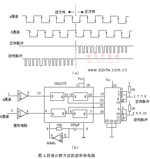 图4是一个既能防止误脉冲又能提高分辨率的四倍频细分电路。在这里,采用了有记忆功能的D型触发器和时钟发生电路。由图4可见,每一道有两个D触发器串接,这样,在时钟脉冲的间隔中,两个Q端(如对应B道的74LS175的第2、7引脚)保持前两个时钟期的输入状态,若两者相同,则表示时钟间隔中无变化;否则,可以根据两者关系判断出它的变化方向,从而产生‘正向’或‘反向’输出脉冲。当某道由于振动在‘高’、‘低’间往复变化时,将交替产生‘正向’和‘反向’脉冲,这在对两个计数器取代数和时就可消除它们的影响(下面仪器的读数也将涉及这点)。由此可见,时钟发生器的频率应大于振动频率的可能最大值。由图4还可看出,在原一个脉冲信号的周期内,得到了四个计数脉冲。例如,原每圈脉冲数为1000的编码器可产生4倍频的脉冲数是4000个,其分辨率为0.09°。实际上,目前这类传感器产品都将光敏元件输出信号的放大整形等电路与传感检测元件封装在一起,所以只要加上细分与计数电路就可以组成一个角位移测量系统(74159是4-16译码器)。