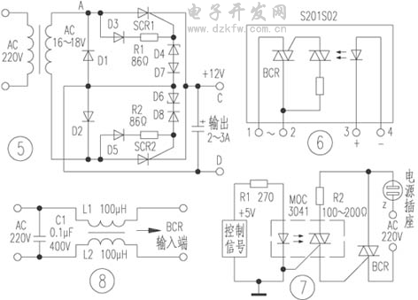 5. 双向可控硅和固体继电器(SSR)。 利用双向可控硅BCR制作调光器是BCR最常见的应用,这里不再复述。笔者剖析过一种Sharp(夏普)固体继电器SSR(S201S02型)产品的内部电路,以此说明BCR的应用,如图6所示。由图可见,该SSR产品是由双向可控硅BCR和光耦合交流过零触发电路共同组成的,因此该SSR的效率高(即功耗小)、自身引起的电噪声(脉冲式干扰)很小。利用图6的内部电路,读者完全可以自制SSR,并把他应用到控制电路中,如图7可控制交流(220V)电源的插座电路。图中的光耦合器MOC3041为BCR提供交流过流触发信号。一般MOC3041的输入控制电流约20mA,所以当控制信号为5V时,其限流电阻取270Ω。图中的R2是控制BCR门极(G)触发电流的,该值应随使用BCR型号而调整的,一般6A/700V的BCR,其G极所需的触发电流约10mA,即可可靠触发BCR工作。图中的Z为交流电源插座。当图7中的控制信号输出5V电平时,BCR导通,Z上即有220V的电压输出,反之,Z无输出电压。