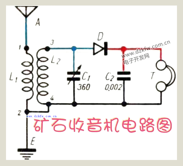 上图中,A、E分别为天线和地线,可变电容C1与线圈L2组成一个谐振电路,调节C2,即可选择所要收听的电台。D就是检波用的矿石,C2为高频滤波电容,用以滤除检波后残留的高频成分。由于这种收音机没有低频放大电路,也不需电源,故其需要采用高阻抗耳机来收听,图中的T即为高阻抗耳机。