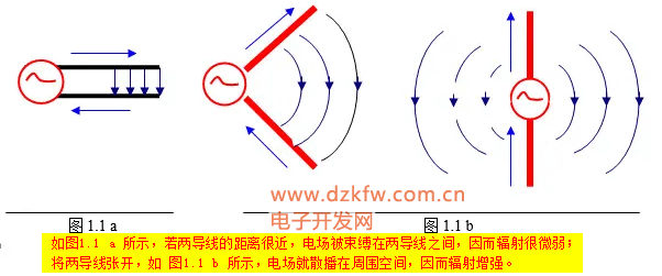 导线载有交变电流时,就可以形成电磁波的辐射,辐射的能力与导线的长短和形状有关.如 图1.1 a 所示,如由于两导线的距离很近,且两导线所产生的感应电动势几乎可以抵消,因而辐射很微弱。如果将两导线张开,如 图1.1 b 所示,这时由于两导线的电流方向相同,由两导线所产生的感应电动势方向相同,因而辐射较强。当导线的长度L远小于波长时,导线的电流很小,辐射很微弱。