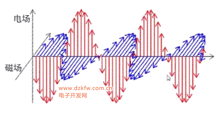 作为发射器的天线,让一定数量的电荷通过它流动,产生一个沿多个方向扩展的磁场,作为接受器的天线将受到该电磁场的影响,产生交流电流,该电流与电磁场频率相似,因此与发射天线中电流相一致,从而实现信息传输。 安倍定律:安培定律是磁作用的基本实验定律 ,它决定了磁场的性质,提供了计算电流相互作用的途径。当电荷通过导体移动时,会产生一个磁场,也可以表示为磁通量,形成一个闭合电路且磁场有一个特定方向,而这个方向可以通过安培定则判断。 法拉第-伦兹定律:当导体以某一速度运动穿过磁场时,导体内的自由电子将会感受到磁场力的作用,从而在导体两端产生电势差和电流。可以理解为变化的磁场产生电场,而恒定的磁场并不会产生电场。 根据以上分析,处于空间中的导体片,可变的磁场将令其产生一种交变电流,电荷交替的移动,从而产生电位差和相应的电场。有了电场,就有了磁场,有了磁场,就有了电场,如此循环,就有了电磁场和电磁波。我们把变化的电场产生的可变磁场称为电磁场,由于磁场可以用特定的磁通量线描述,电场可由指向电位差的向量描述,我们可以将其随时间在空间上的变化路径,这样可以得到两个垂直的正弦波或余弦波。