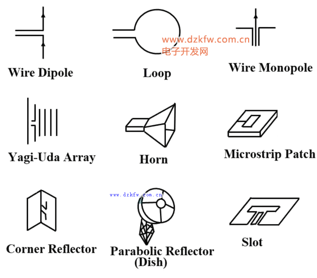 1)有线天线,包括偶极子天线、螺旋天线、八木天线等多种线形排列的天线,使用细线建造的线状通常增益较低,最常在低频率下使用,且轻巧,易于设计和制造;
