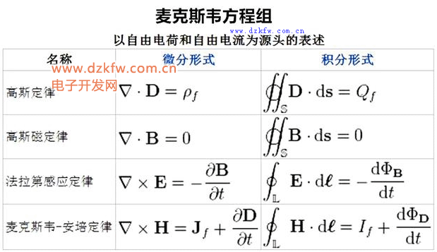 天线所发射或接受的无线电波是一种能量传输形式,即电磁波。在传播过程中,电场和磁场在空间上相互垂直,同时这两者又垂直于传播方向。 电磁场三维图: 电磁波传播平面图: 英国物理学家詹姆斯·克拉克·麦克斯韦在19世纪通过数学推导建立了一组描述电场、磁场与电荷密度、电流密度之间关系的偏微分方程。