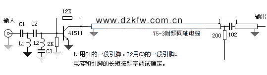 这支天线制作不难,材料易得,增益却不低,实测将近10dB,非常适合解决做实验的临时需要,也适合用作接收远台的微弱电视信号,不过此时应该配用下图的天线放大器。