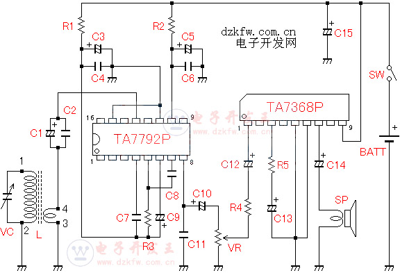TA7792中波收音机电路图.功放使用TA7368,电路很简单。
