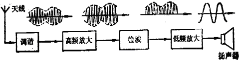 收音机接收的经过调制的高额振荡电流(对应图讲解),这种电流通过收音机的耳机或扬声器,并不能使它们振动而发声,为什么呢,假定某一个半周期电流的作用是使振动片向某个方向运动,下一个半周期电流就以几乎同样大的作用使振动片向反方向运动.高频电流的周期非常短,半周期更短,而振动片的惯性相当大,所以在振动片还没有来得及在电流的作用下向某个方向运动的时候,就立刻有一个几乎同样大的作用要使它向反方向运动,结果振动片实际上不发生振动.要听到声音,必须从高频振荡电流中"检"出声音信号,使扬声器(或耳机)中的动片随声音信号振动。