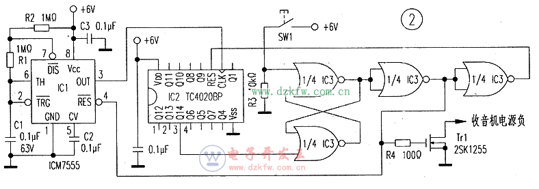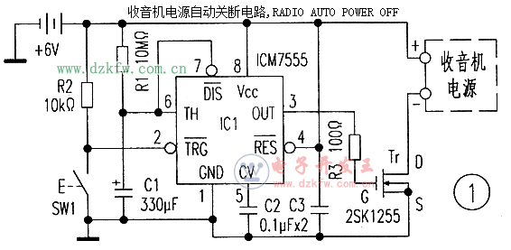 图1电路能在一定时间后.自动关断设备的供电电源。电路选用CMOS型的时基集成电路ICM7555,作一次性动作。以收音机电源控制为例.首先按下起动开关SW1,在时基Ic的②脚电压达到电源电压的1/3以下时.时基Ic内部触发器翻转,输出脚③转变为高电平“H”MOSFET管Tr1的漏-源极间导通,接通收音机的电源。