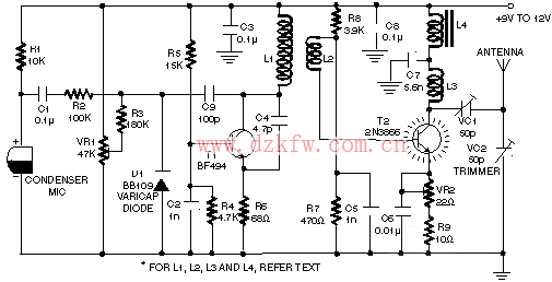The circuit built around transistor T1 (BF494) is a basic low-power variable-frequency VHF oscillator. A varicap diode circuit is included to change the frequency of the transmitter and to provide frequency modulation by audio signals. The output of the oscillator is about 50 milliwatts. Transistor T2 (2N3866) forms a VHF-class A power amplifier. It boosts the oscillator signals? power four to five times. Thus, 200-250 milliwatts of power is generated at the collector of transistor T2.