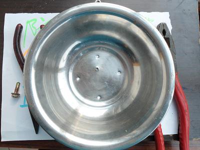 把不锈钢小盆像这样钻两个孔。用铅笔定好位,再用钉子砸出一个小孔,接着用剪刀扩大这个孔,