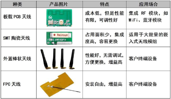 (1) 板载PCB式天线:采用PCB蚀刻而成,成本低,但是性能有限,可调性好,可大批量用于蓝牙、WiFi无线通信模块。