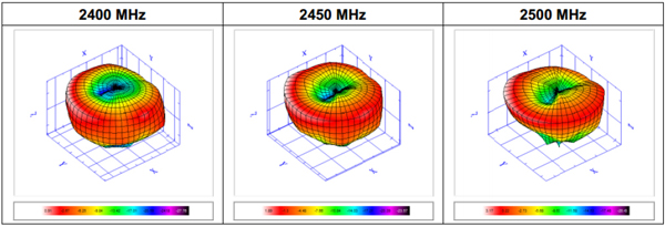 天线都有方向性,指的是天线对空间不同方向具有不同的辐射或接收能力。衡量天线方向性通常使用方向图,错误!未找到引用源。所示是一个频率范围从2400MHz到2500MHz天线的方向图。