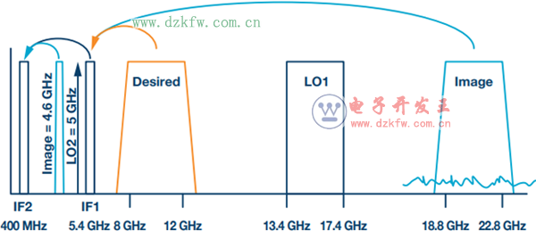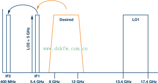 图2所示为一个X波段超外差接收机频率规划示例。该接收机希望接收8 GHz和12 GHz之间的信号,带宽为200 MHz。目标频谱与可调谐本振(LO)混频,产生5.4 GHz IF。然后,5.4 GHz IF与5 GHz LO混频以产生最终的400 MHz IF。最终IF范围是300 MHz至500 MHz,这是很多ADC能够发挥良好性能的频率范围。