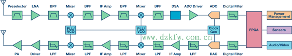 图1. 传统X和Ku波段超外差接收和发射信号链