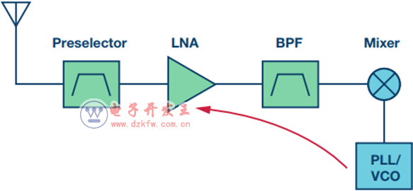 除镜像抑制外,还必须有力地滤除从混频器返回接收输入连接器的LO功率水平。这样可确保无法因为辐射功率而检测到用户。为此,LO应远离RF通带,确保可以实现充分滤波。